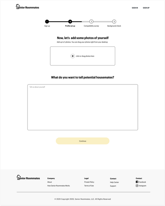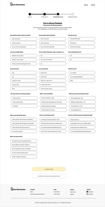 THE CHALLENGE: To design a homeshare and homeseeker listing website that matches the homeowner and the homeseeker based on shared lifestyles. Also, to design the sign up, profile, compatibility survey and background check application process.